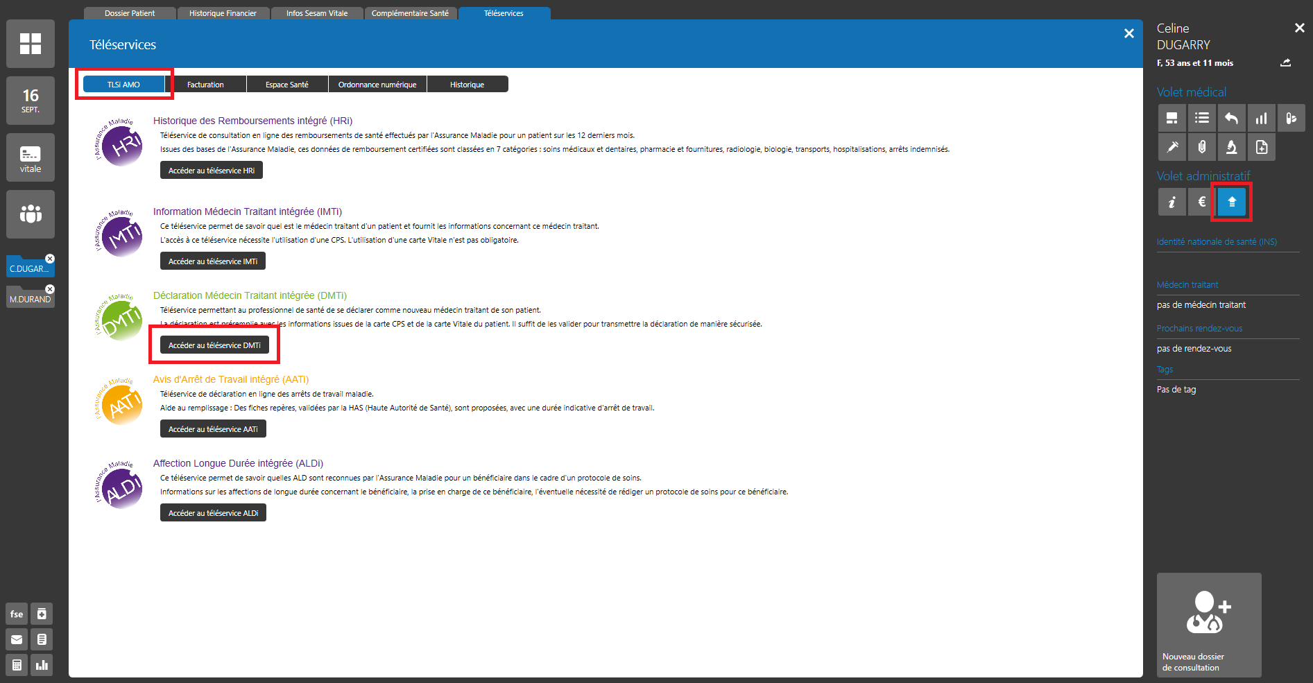 Depuis le volet administratif du dossier patient (partie droite de l’écran), cliquez sur le bouton « Téléservices ».