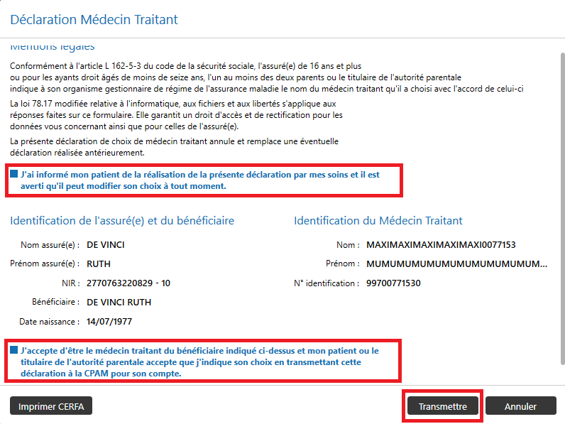 Contrairement à la version web sur Ameli Pro, la plupart des informations sont automatiquement préremplies à partir du dossier patient.