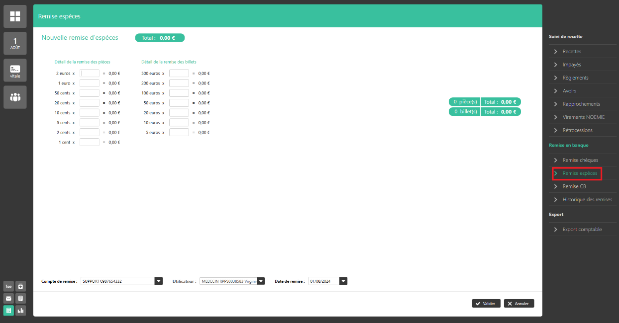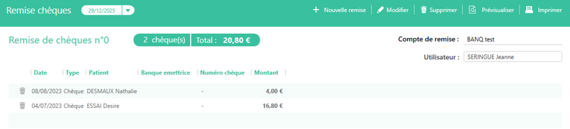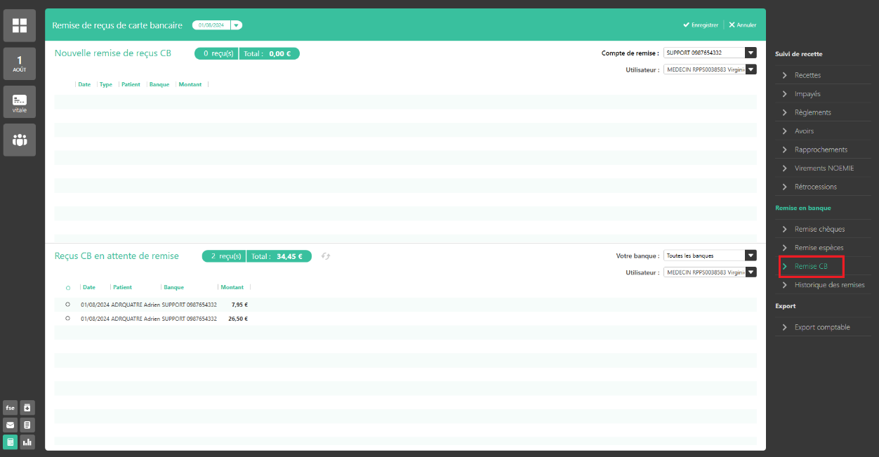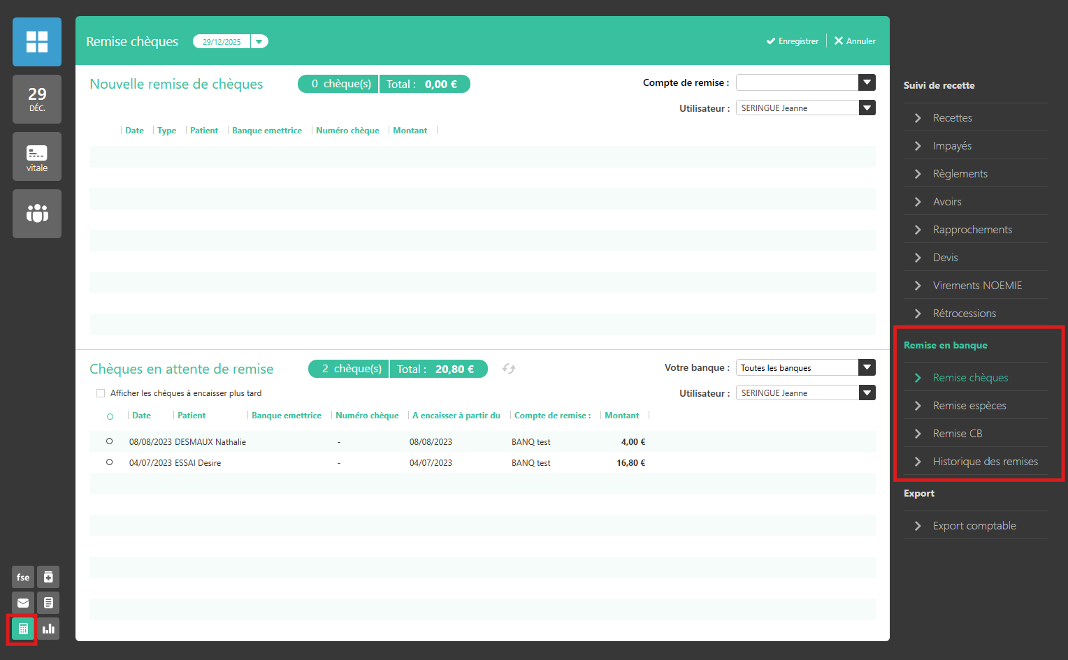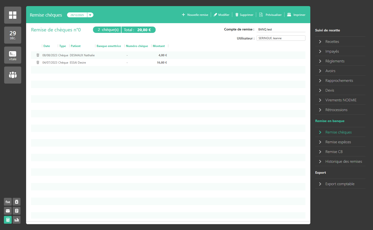 DrSanté permet de gérer les remises en banque pour les chèques, les espèces et les paiements par carte bancaire (CB), et d’éditer les bordereaux de remise correspondants.