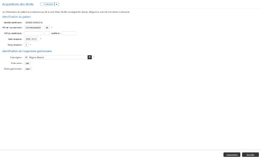 L’option « Acquisition des Droits (ADRi) » permet de récupérer les droits du patient et d’indiquer, par exemple, si celui-ci bénéficie d’une C2S, d’une ALD, etc.