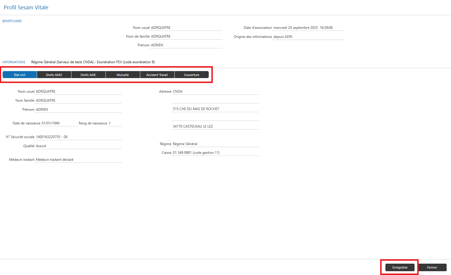 - Cliquez sur « Enregistrer » (en bas à droite) pour mettre à jour les informations SESAM Vitale dans le dossier patient.