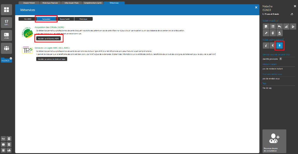 Depuis le volet administratif du dossier patient (partie droite de l’écran), cliquez sur le bouton « Téléservices ».