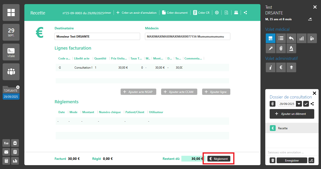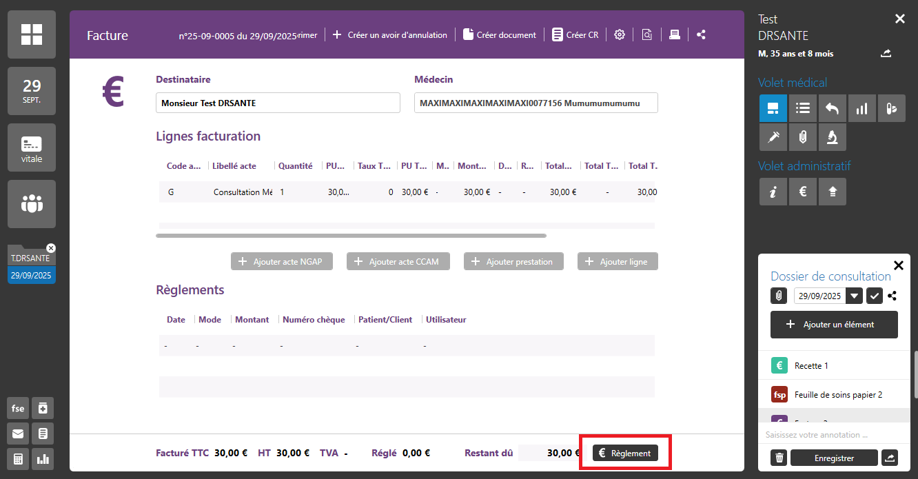 Le bouton € / Règlement est toujours accessible après validation d’une facture, FSE ou recette