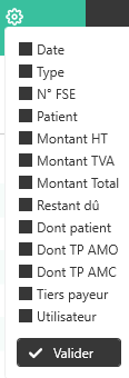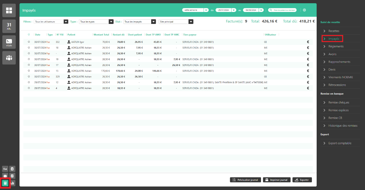 - Le module Impayés permet de suivre toutes les factures ou FSE non réglées.