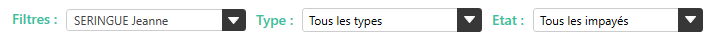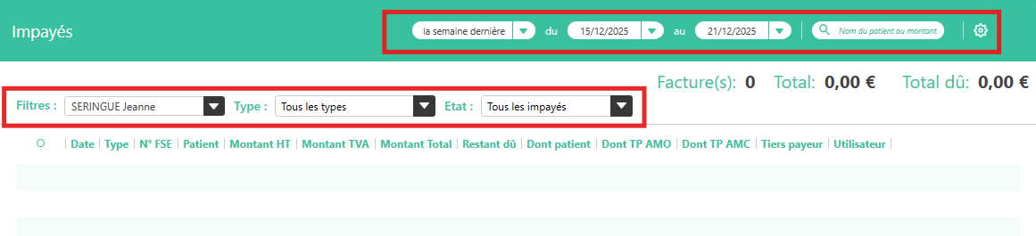 3. Filtre utilisateur : afficher les impayés d’un praticien spécifique.