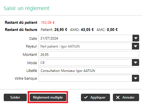 - Le règlement peut être saisi pour une ou plusieurs factures.