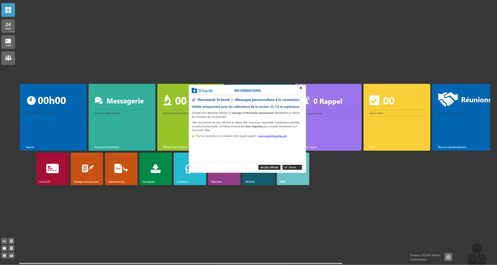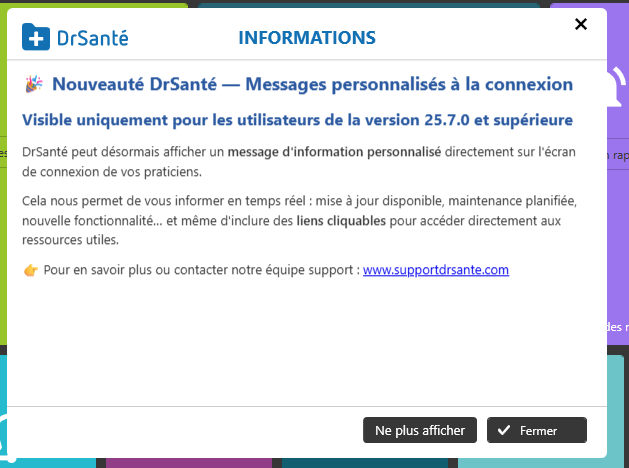 Un nouveau système de messages fait son apparition à l’ouverture de DrSanté. Ce “Widget Info” nous permettra de vous transmettre des actualités ciblées (nouveautés réglementaires, conseils d’utilisation) selon votre spécialité.